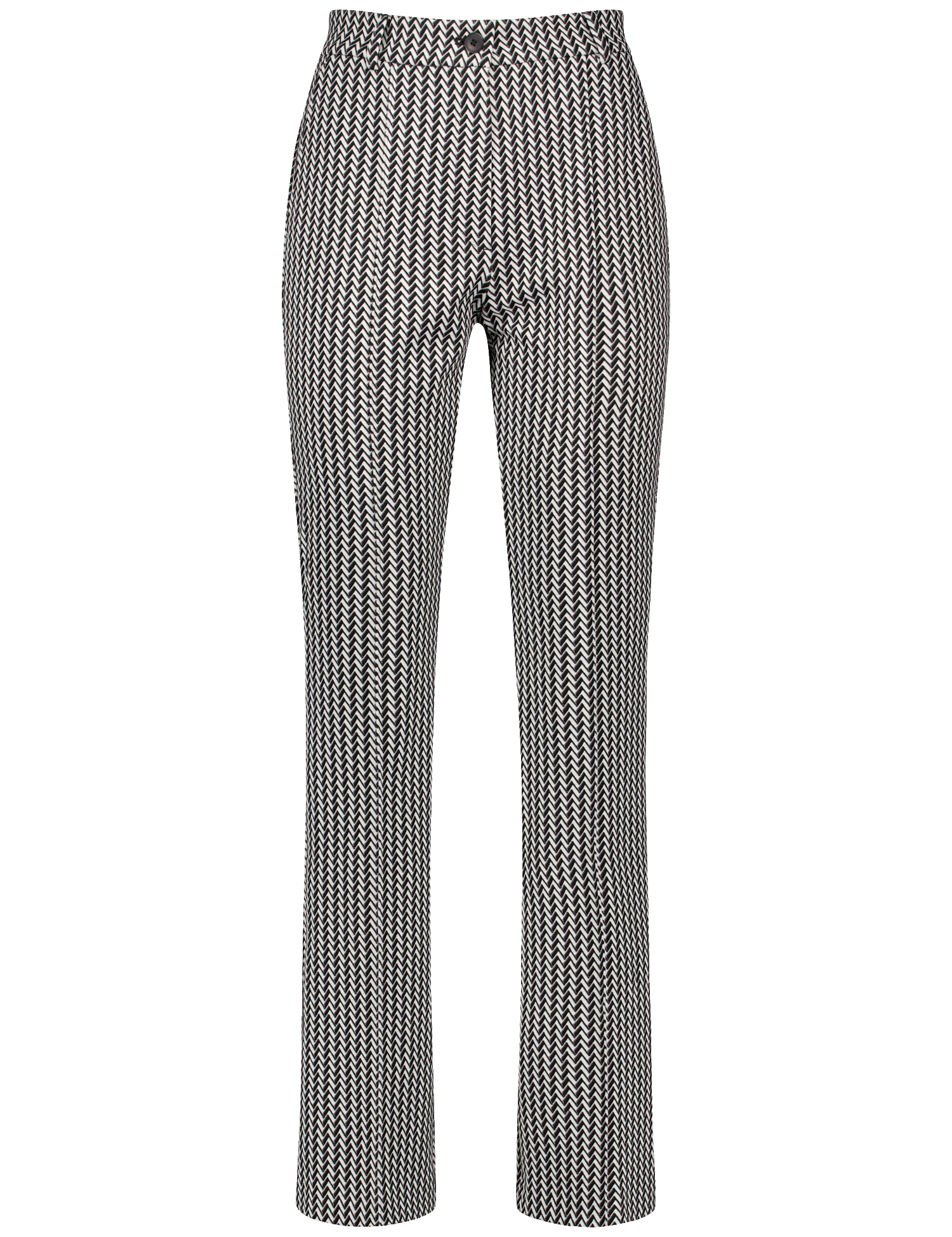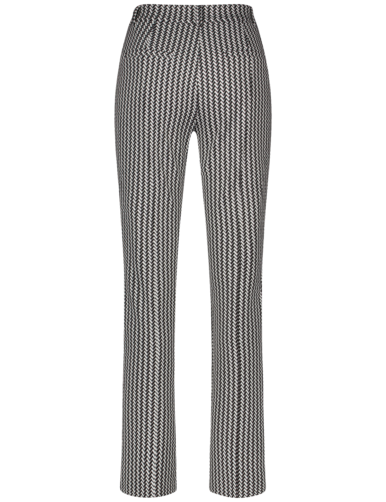 Der elastische Bund bietet angenehmen Halt und sorgt für ein komfortables Tragegefühl. Der gerade Beinverlauf betont die Figur, ohne einzuengen, und verleiht dem Look eine moderne, gepflegte Note. Das grafische Muster wirkt modisch und dennoch zeitlos – perfekt für einen souveränen Auftritt.
