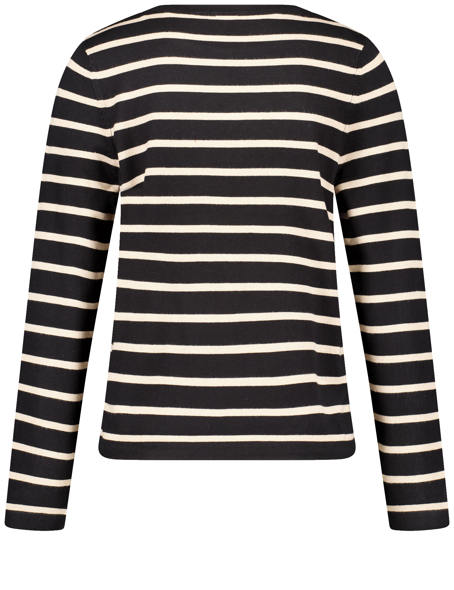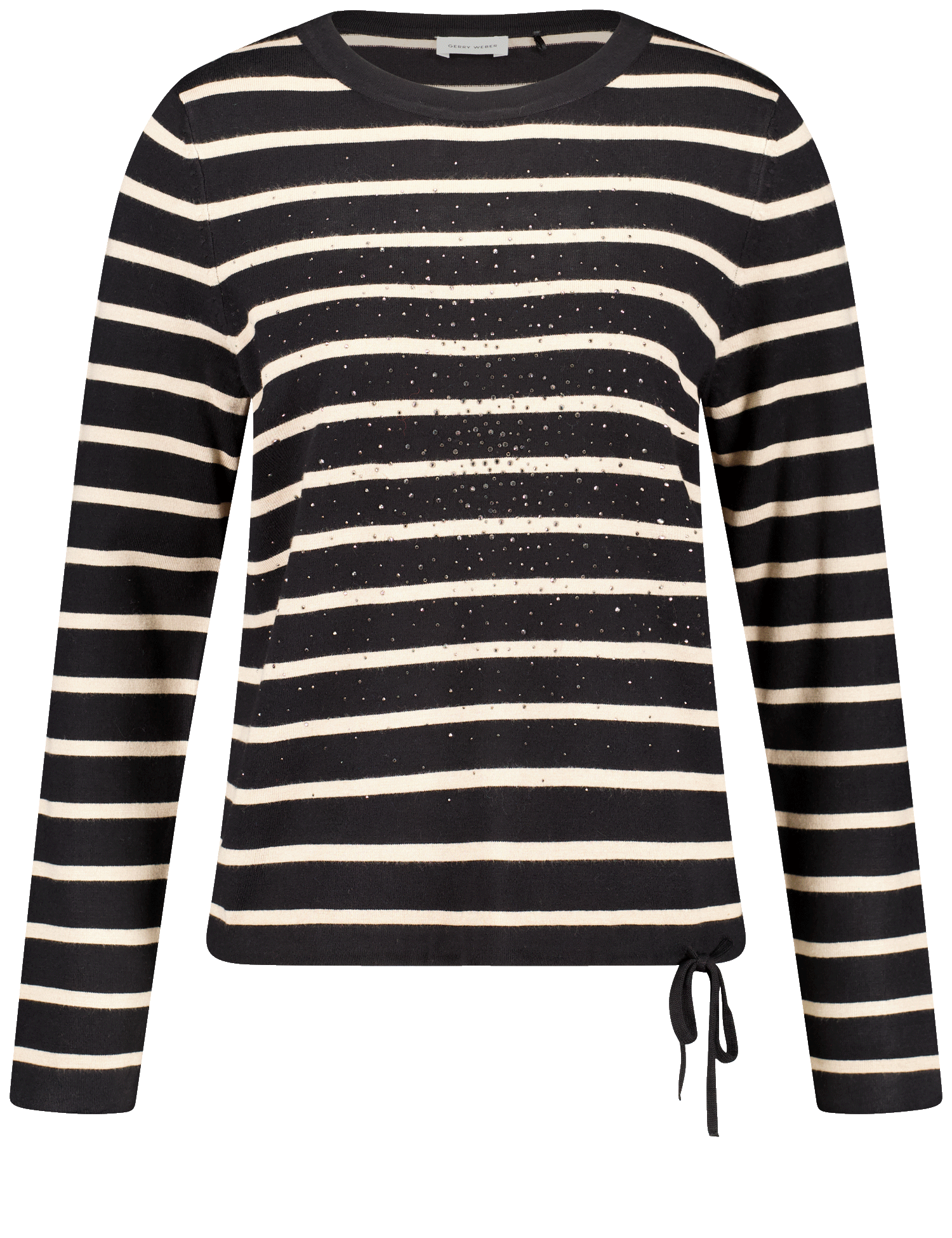 Dieses modische Langarmshirt überzeugt mit einem klassischen Streifenmuster und funkelnden Ziersteinen im Vorderteil. Die legere Passform und das Bindeband am Saum verleihen dem Design eine feminine Note – perfekt für einen gepflegten Alltagslook. Erhältlich in den Größen 36 bis 46.