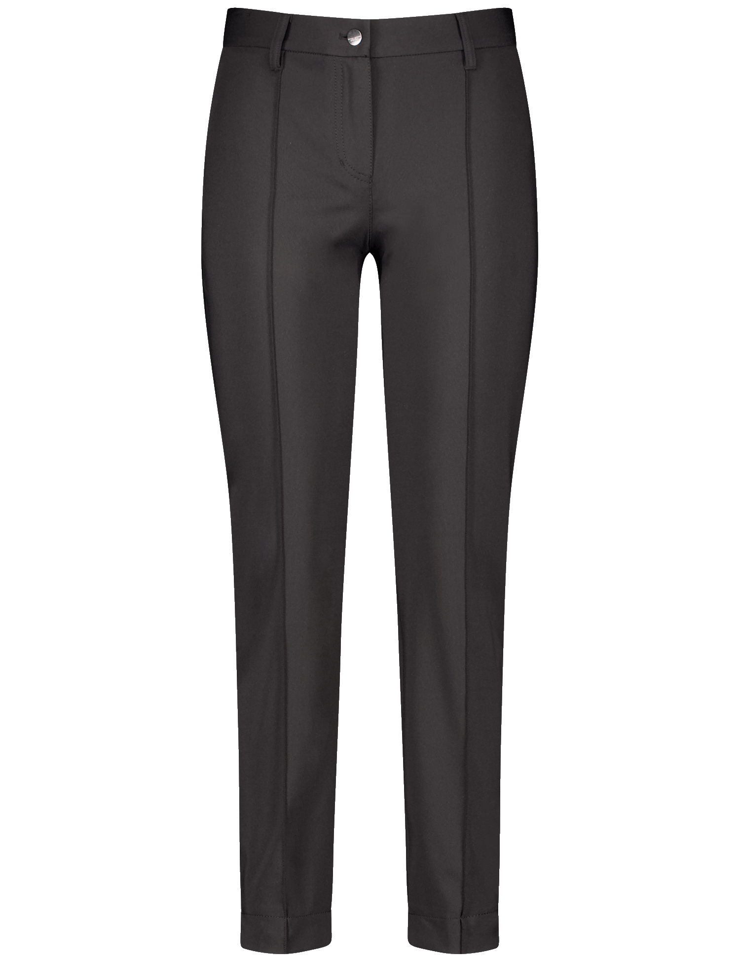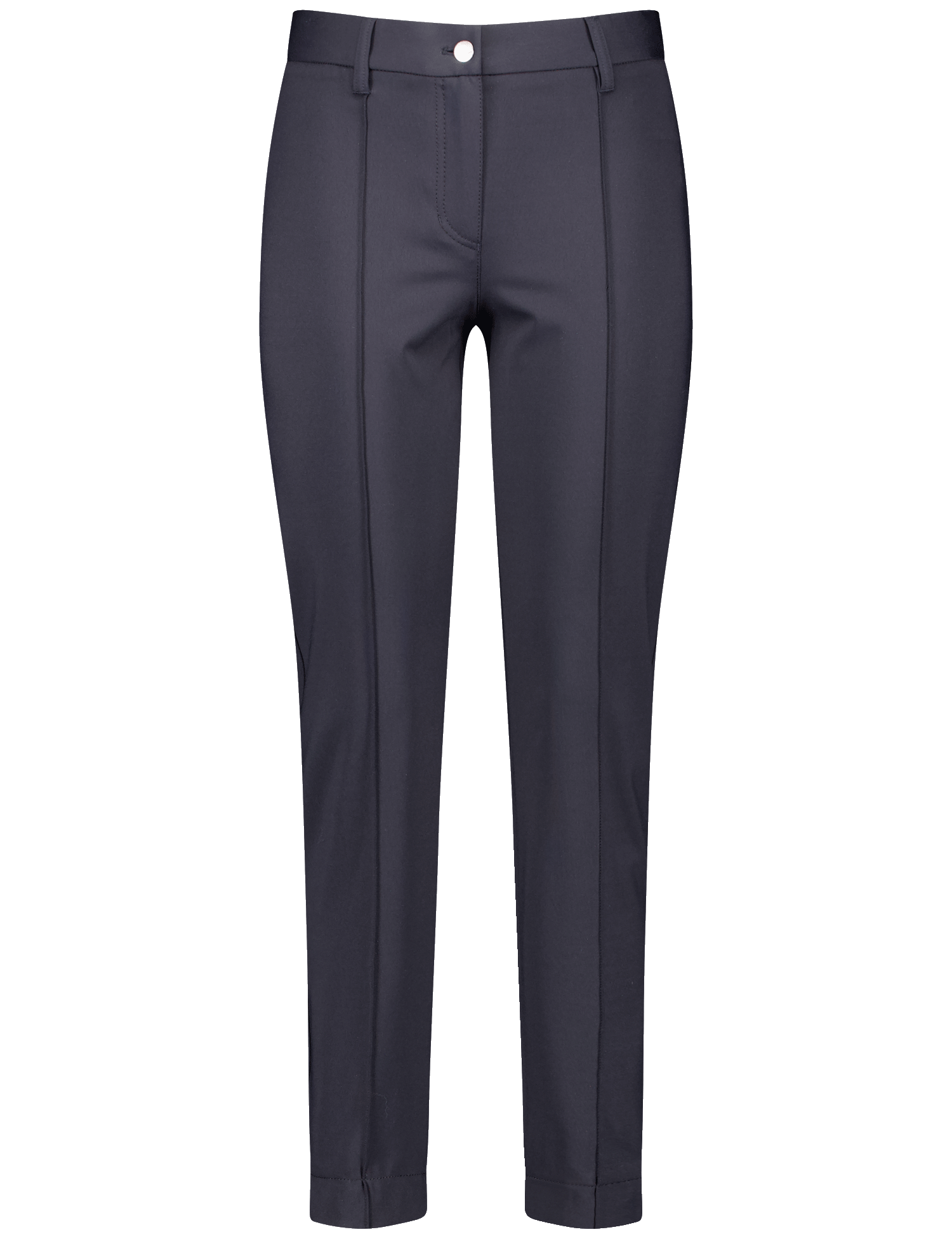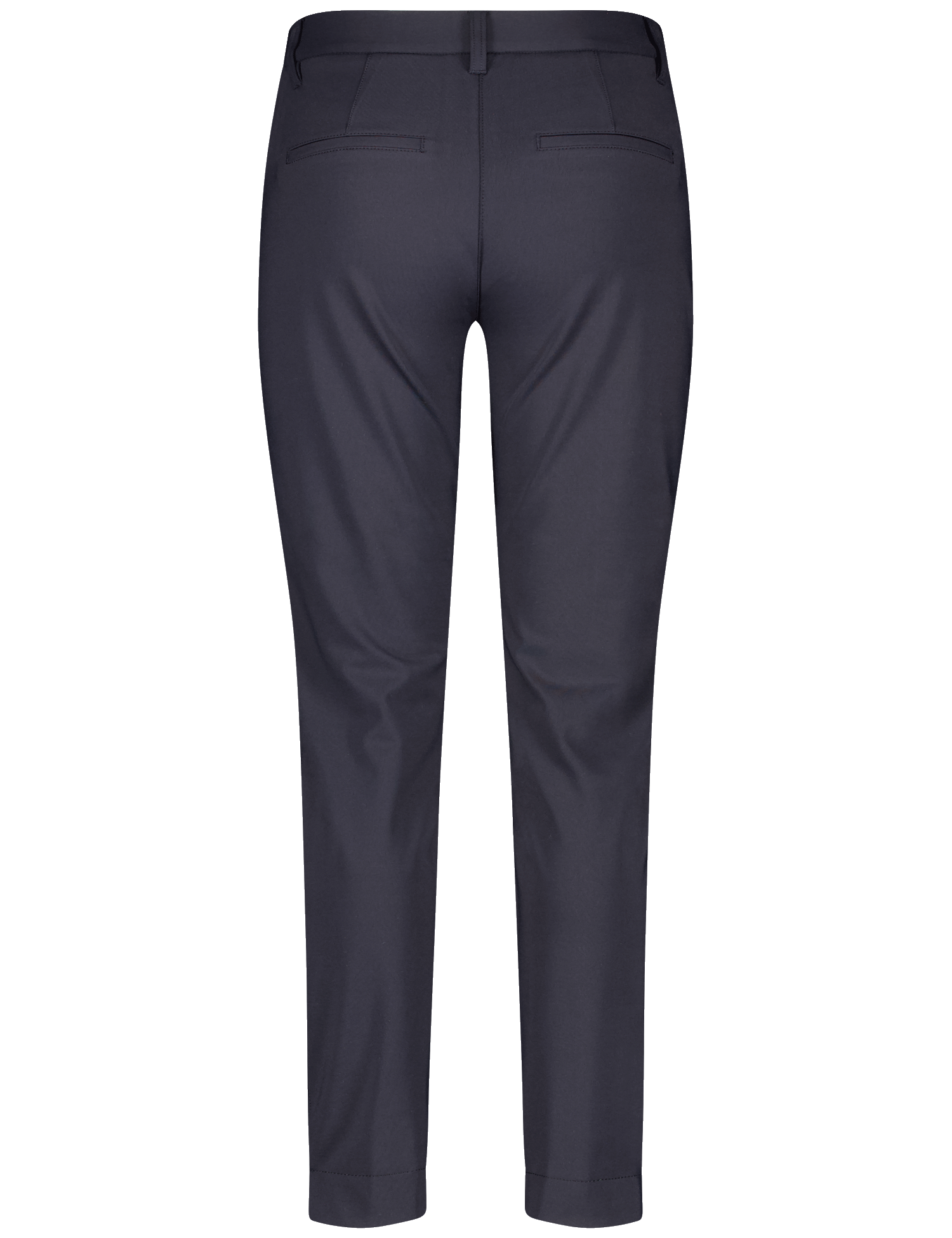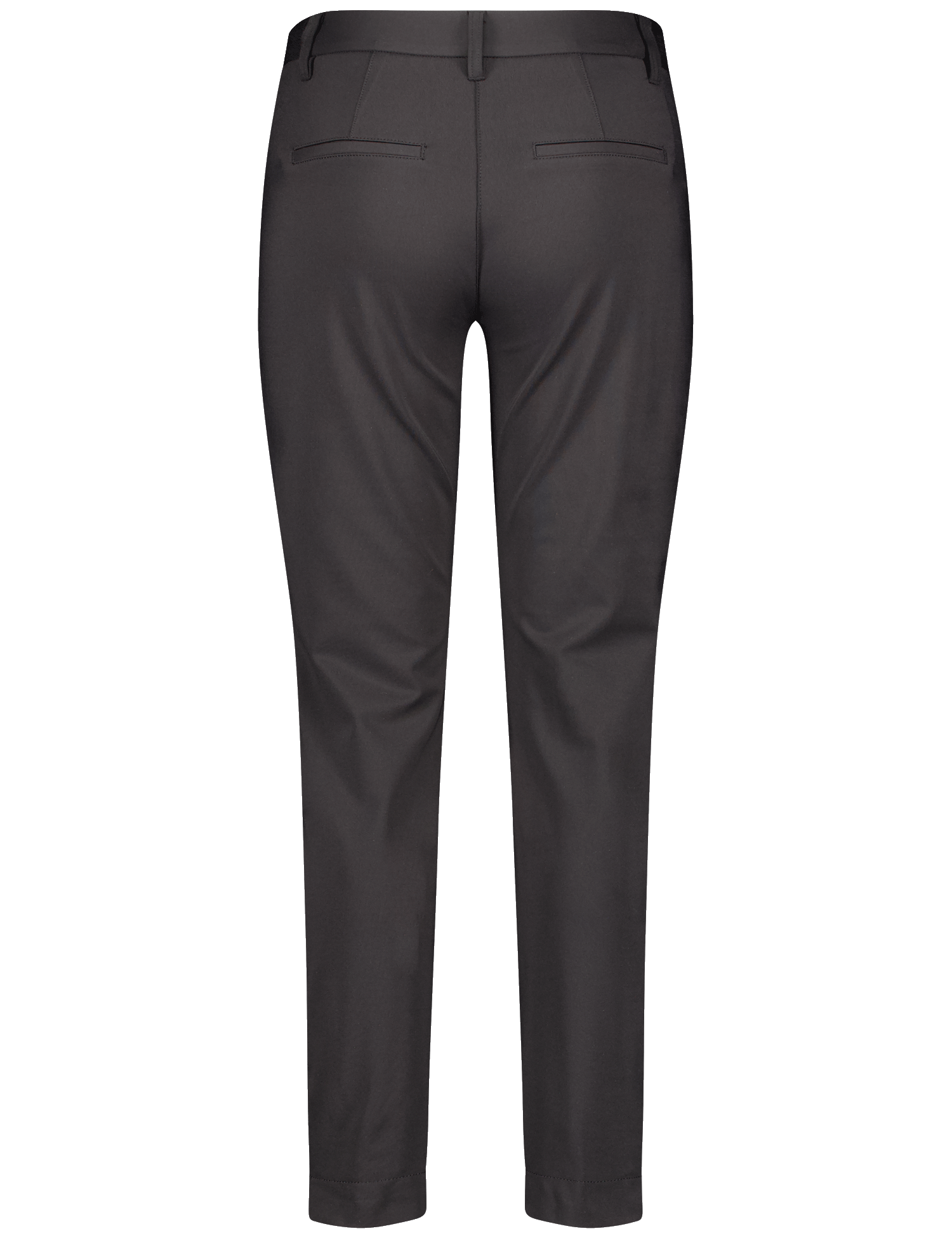 Der schmale Schnitt verleiht der Hose eine feminine Note, während der mittelhohe Bund für bequemen Sitz sorgt. Formgebende Nähte vorn und hinten unterstreichen die moderne Linienführung. Gürtelschlaufen und angedeutete Gesäßtaschen runden das dezente Design ab und machen die Hose zum vielseitigen Kombipartner – ob im Büro oder in der Freizeit.