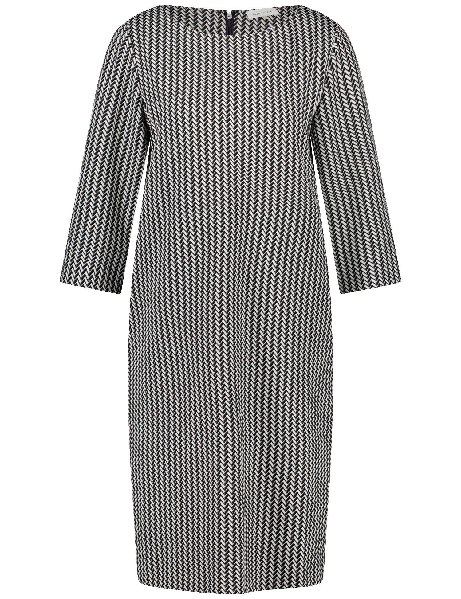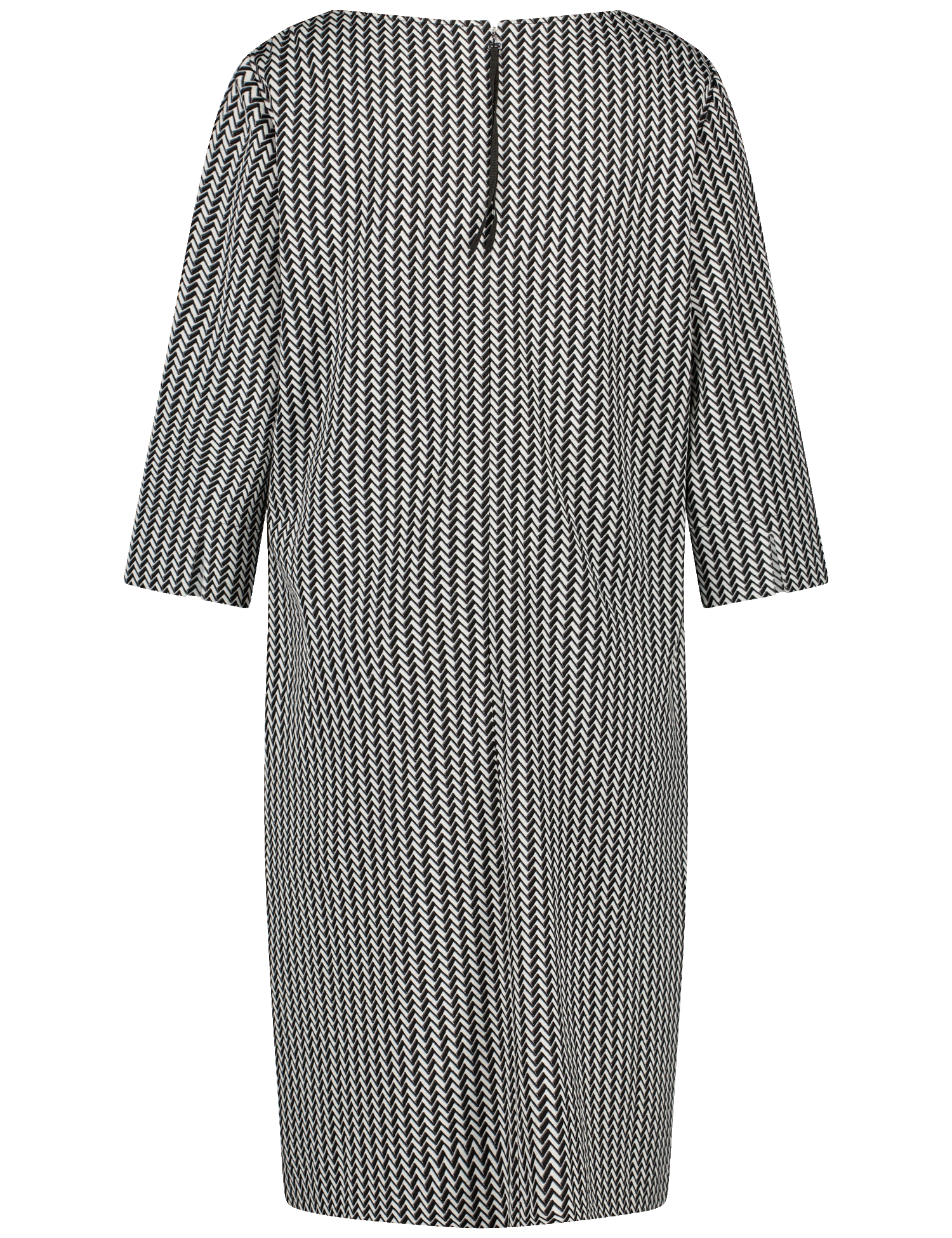 Dieses stilvolle Kleid mit dezentem Zickzack-Muster vereint klare Linien mit moderner Raffinesse. Der grafische Druck in Schwarz und Weiß sorgt für eine elegante, lebendige Optik, die sowohl im Alltag als auch zu besonderen Anlässen überzeugt. Ideal für Frauen, die ein gepflegtes Erscheinungsbild und hochwertige Materialien schätzen.